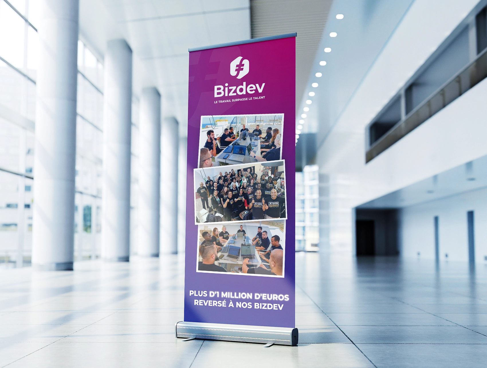L'entreprise voulait un logo rappelant l'aspect monétaire du business développement, ainsi qu'un clin d'oeil au "F" de Bizdev Family, tout en rendant l'ensemble plutôt jovial.